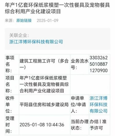 浙江洋博环保科技有限公司在温州平阳宠物小镇投资 10.12 亿元建设年产 1 亿套环保纸浆模塑餐具及宠物餐具生产线,占地 4.4 万平方米,规划 3 栋智能生产车间和 1 栋研发中心。项目建成后将形成1 亿套环保餐具 + 1 亿套宠物餐具的年产能,成为华东地区纸浆模塑核心基地。其双赛道战略明确,通过共享纸浆模塑工艺实现餐饮包装(纸杯、纸碗)和宠物用品(食盆、水碗)生产线的柔性调配。