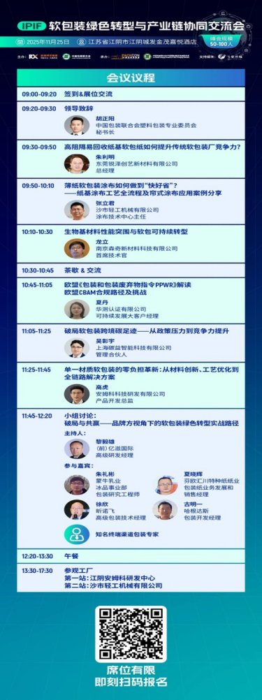 为了帮助软包装相关企业更好的提前布局、抢占先机,PACKCON中国包装容器展联合中国包装联合会塑料包装委员会,将在江阴举办软包装绿色转型与产业协同交流会,议程如下: